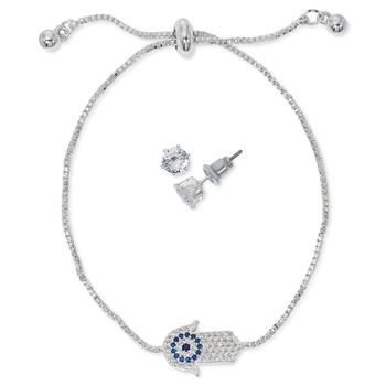Silver-Plate 2-Pc. Set Cubic Zirconia Hamsa Hand Bolo Bracelet & Stud Earrings