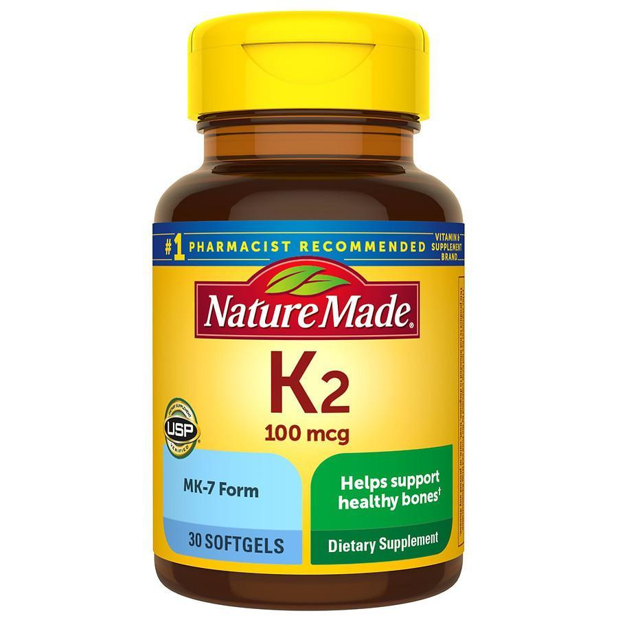 Nature Made Vitamin K2 100 mcg Softgels are bone health supplements that work with the Calcium in your body to support healthy bones. Sourced from high-quality ingredients, these gluten free Vitamin K2 supplements contain no synthetic dyes and no artificial flavors. This K2 bone supplement is designed to deliver Vitamin K2 as MK-7 form to support bone health. Adults take one of these Vitamin K2 supplement softgels daily with water and a meal. Nature Made supplements are quality you can trust. USP has tested and verified ingredients, potency and manufacturing process. USP sets official standards for dietary supplements. Visit the USP verified website for more information. *Based on a survey of pharmacists who recommend branded vitamins and supplements.