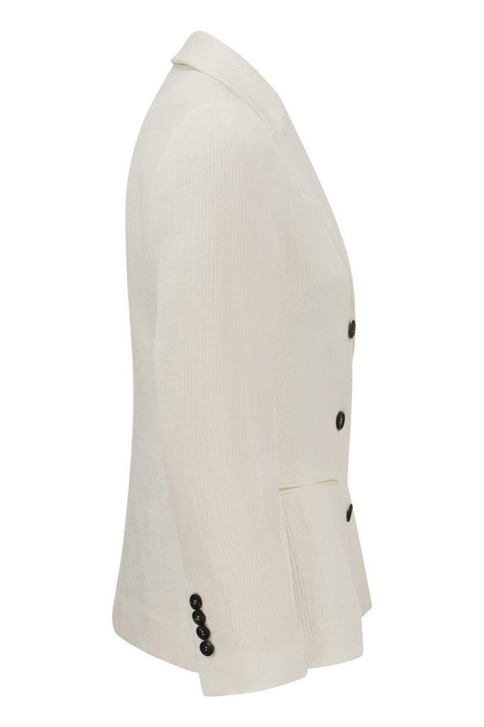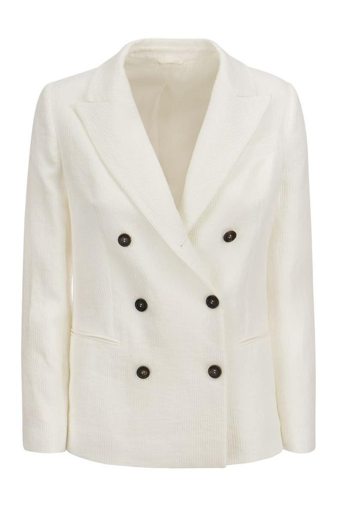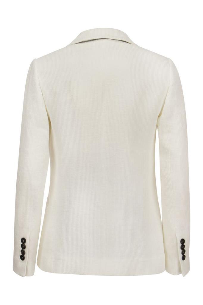 Fine materials meet sophisticated details in the new jacket in linen and cotton canneté. The ribbing running through the fabric gives the garment a slightly three-dimensional effect, as well as an informal feel. At the same time, the low welt pockets and the one and a half breasted buttoning, borrowed from the male wardrobe, recall the classic world of jackets. Finally, a precious embroidery in shiny jewellery on the back of the collar completes the garment with an unexpected shiny and feminine note. - Horn button closure - Chest pocket - Low pockets - Cuffs with four horn buttons - Nickel-free monile decoration DESIGNER ID: MH5872072 C700