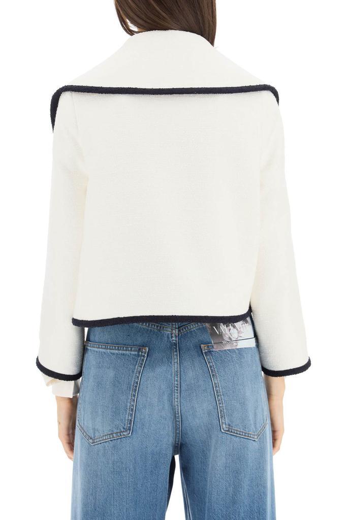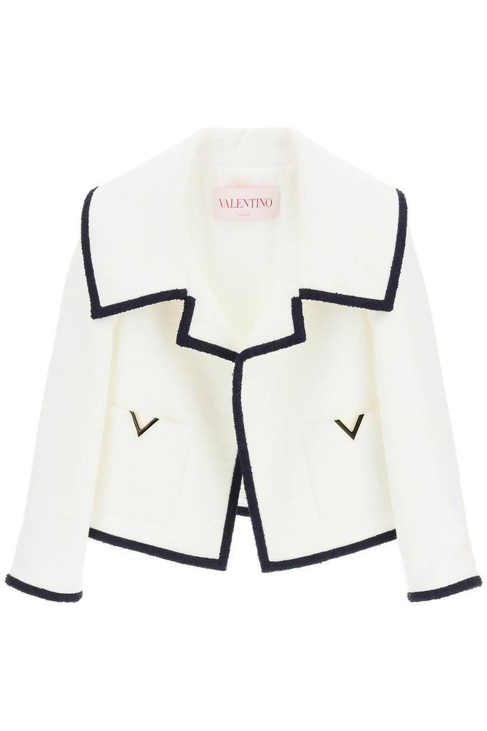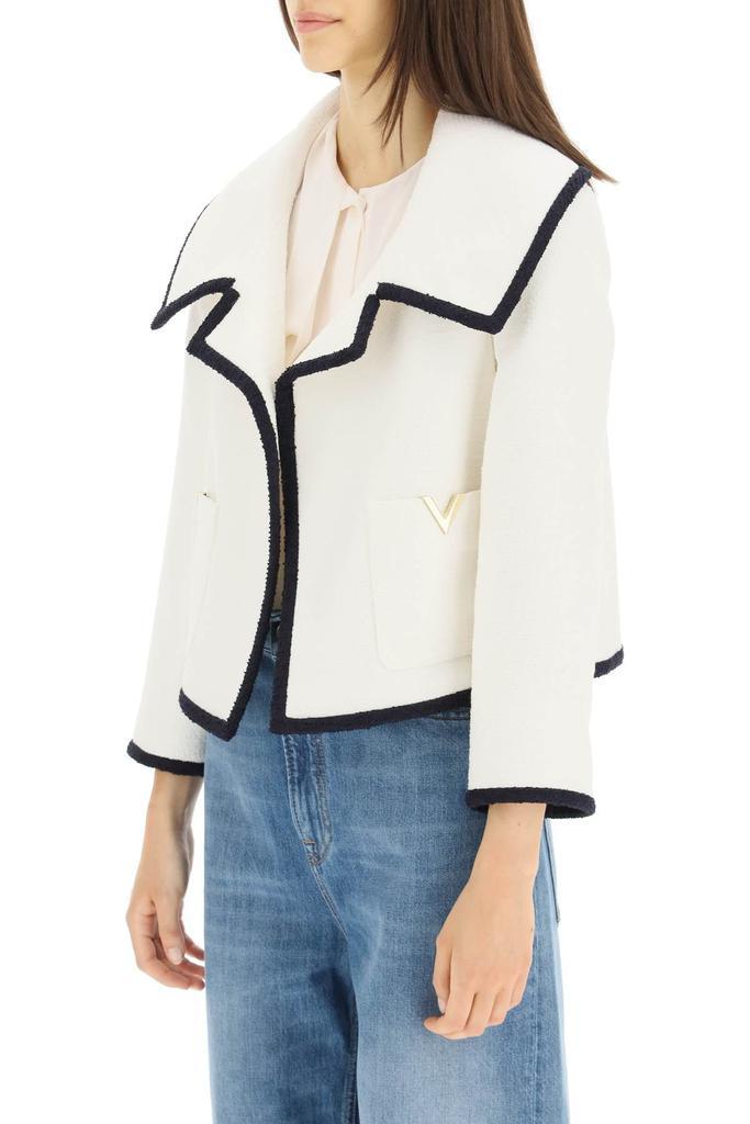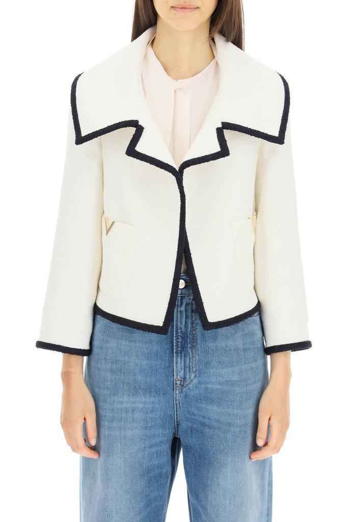 Open jacket by Valentino in cotton wool blend tweed. Oversized lapel and two patch pockets with gold-tone metal V insert at front. Tonal twill-lined interior. Slightly cropped, boxy fit. The model is 177 cm tall and wears a size IT 40.