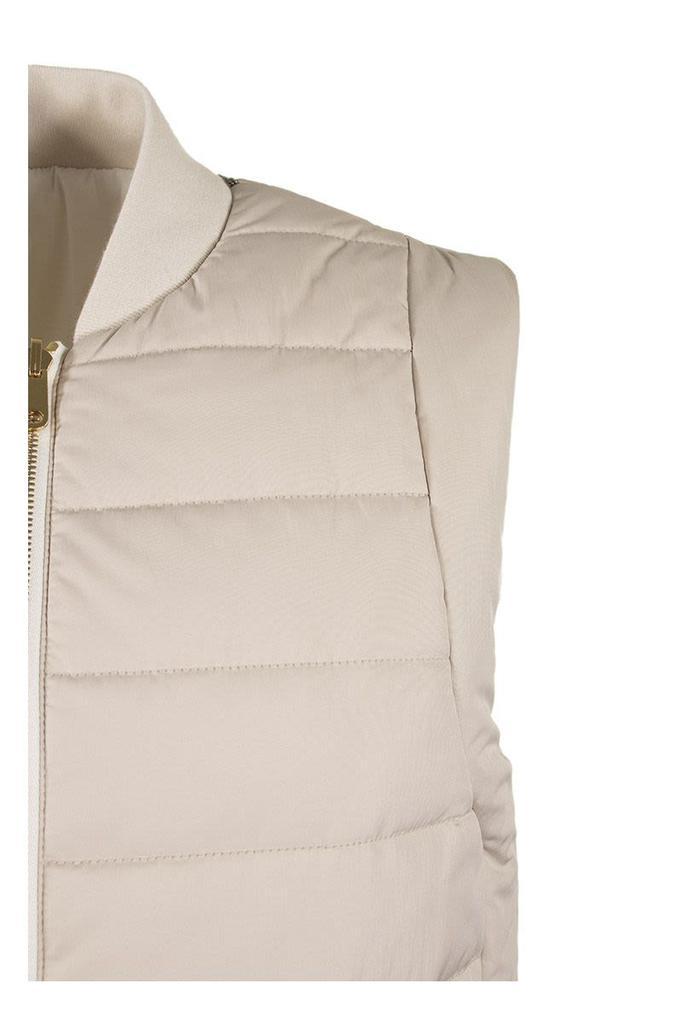 Reversible gilet in water-resistant techno taffeta with Thindown® padding and monili Refined materials enrich the elegant and versatile style of this reversible vest. A water-resistant techno taffeta exterior is paired with a contrast color matte nylon interior. The ribbed collar is reminiscent of classic bomber jacket silhouettes, while a removable belt gathers the volume at the waist. Lightweight Thindown® padding makes the garment particularly suited for the transitional months between seasons. Rows of shiny monili embroidery behind the neck complete the vest with a precious detail. - Two-way zip closure. - Rib knit collar. - Hand pockets with zipper. - Detachable tie belt. DESIGNER ID: MB5718834 C1137