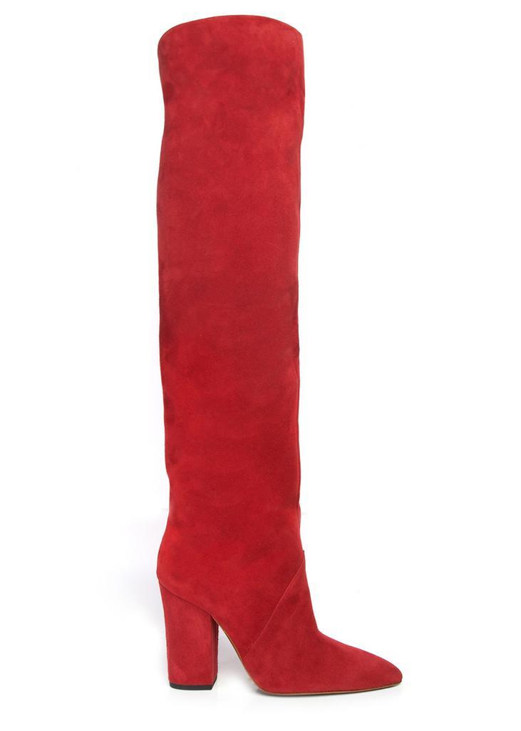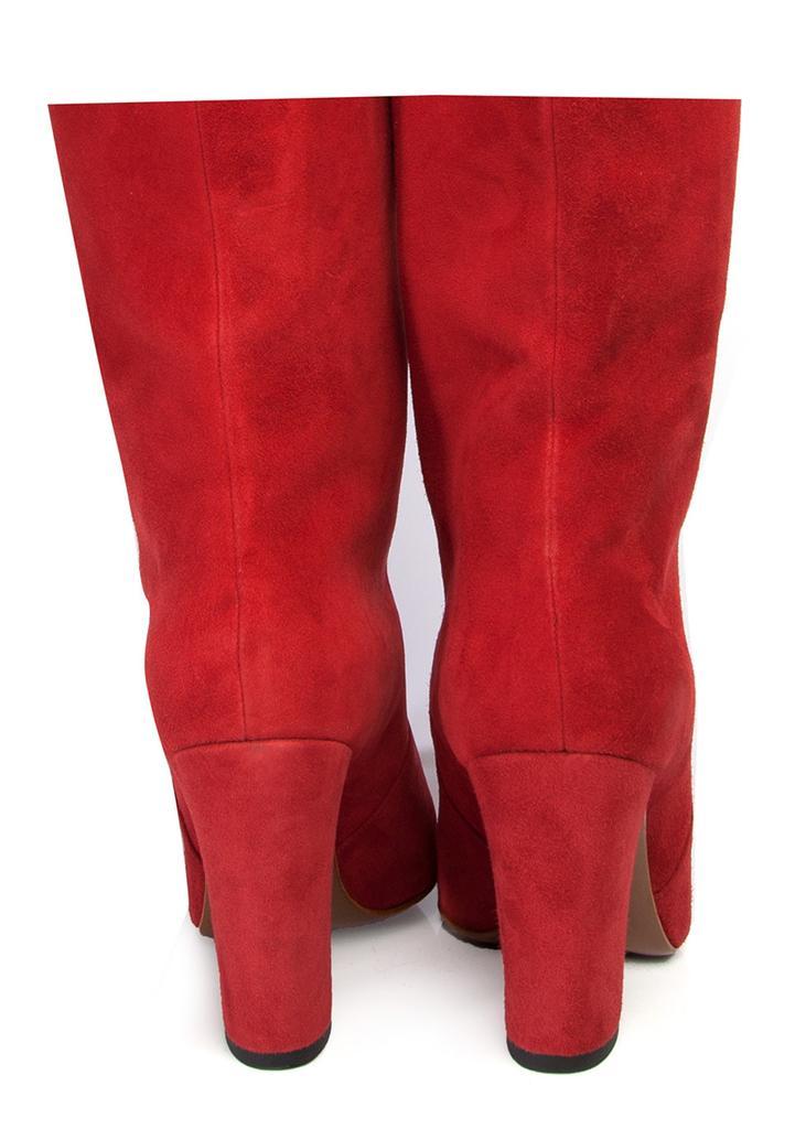 Handcrafted in Italy Over-the-knee, Slip on Suede Boots Heel measures approximately 3.54 inches/ 90mm Red suede leather, leather lining Leather sole, pointed toe Italian sizing, fits true to size Narrow across the toe