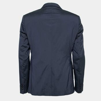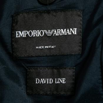 description: Making an impression at your next formal meeting is easy, thanks to this David Line blazer from Emporio Armani. Fashioned in navy-blue cotton fabric, this blazer is finished with a buttoned closure, long sleeves, and three functional pockets. Your formal outfit will appear classy with this blazer.